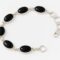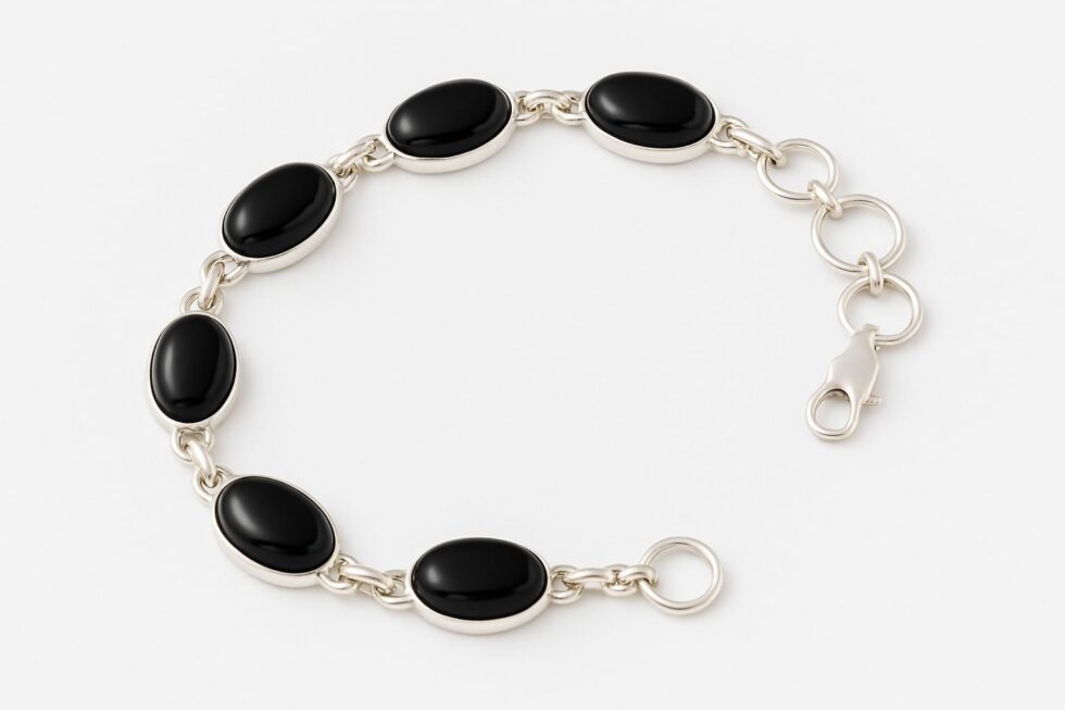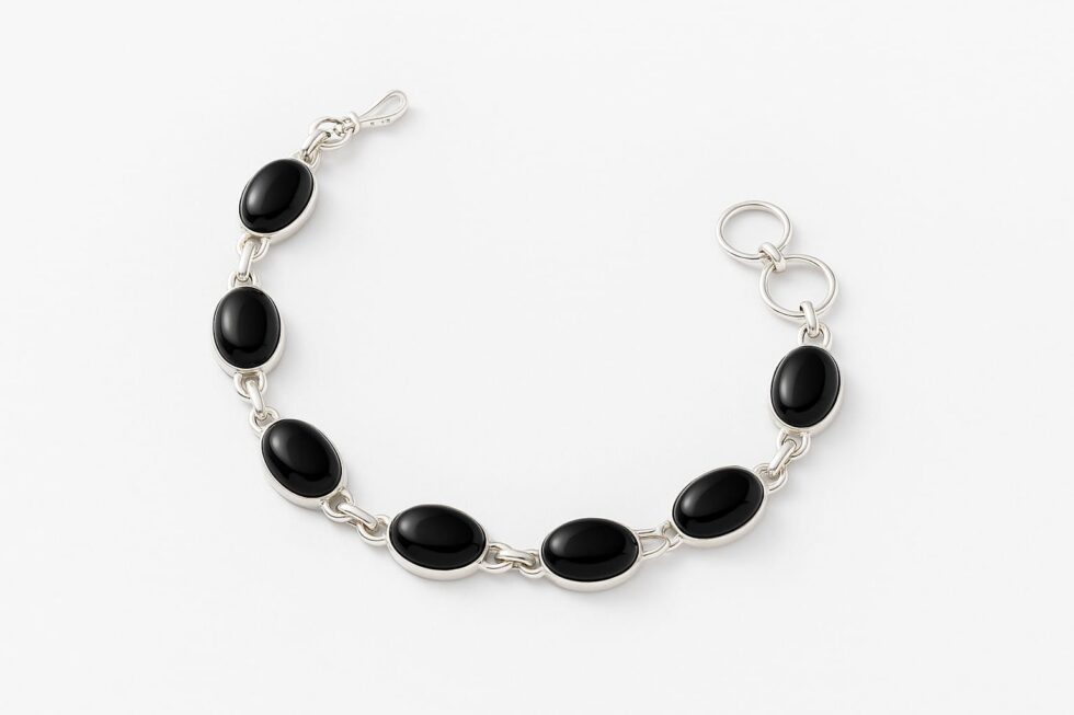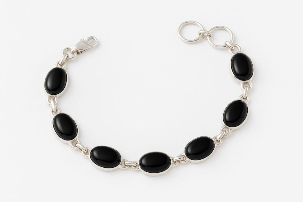 This handcrafted bracelet features polished black onyx cabochons set in sterling silver links, offering a timeless and versatile design. The smooth oval stones are connected with sturdy silver links, creating a refined accessory perfect for both casual wear and special occasions. Adjustable length ensures a comfortable fit for most wrist sizes.