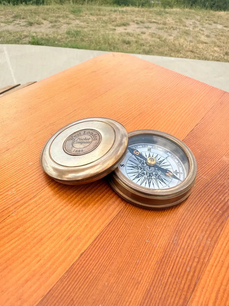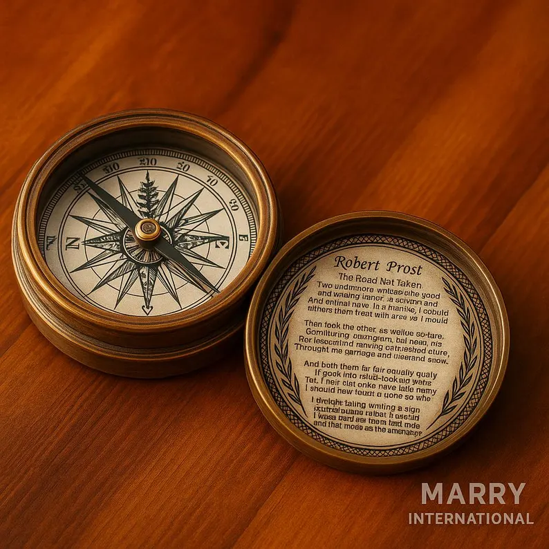 Celebrate life’s journey with this elegant vintage brass compass, beautifully engraved with Robert Frost’s iconic poem “The Road Not Taken.” A perfect blend of poetry and craftsmanship, this piece inspires thoughtful reflection and a sense of adventure.