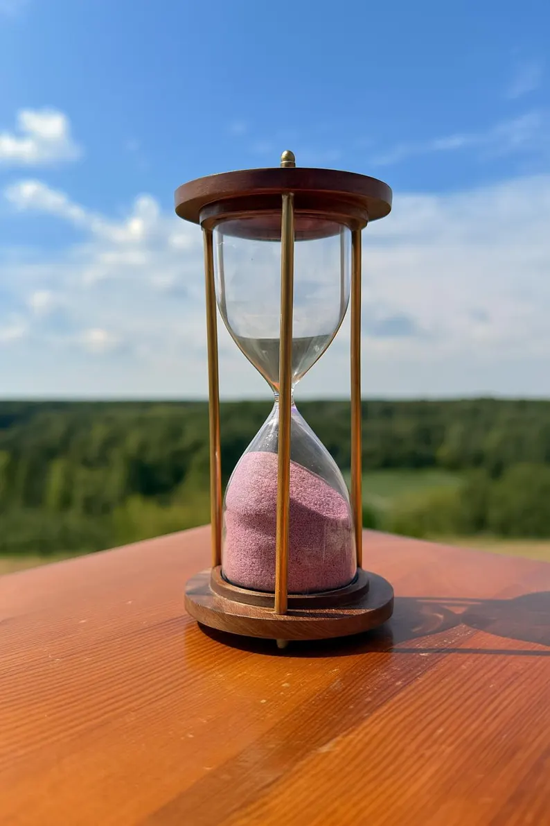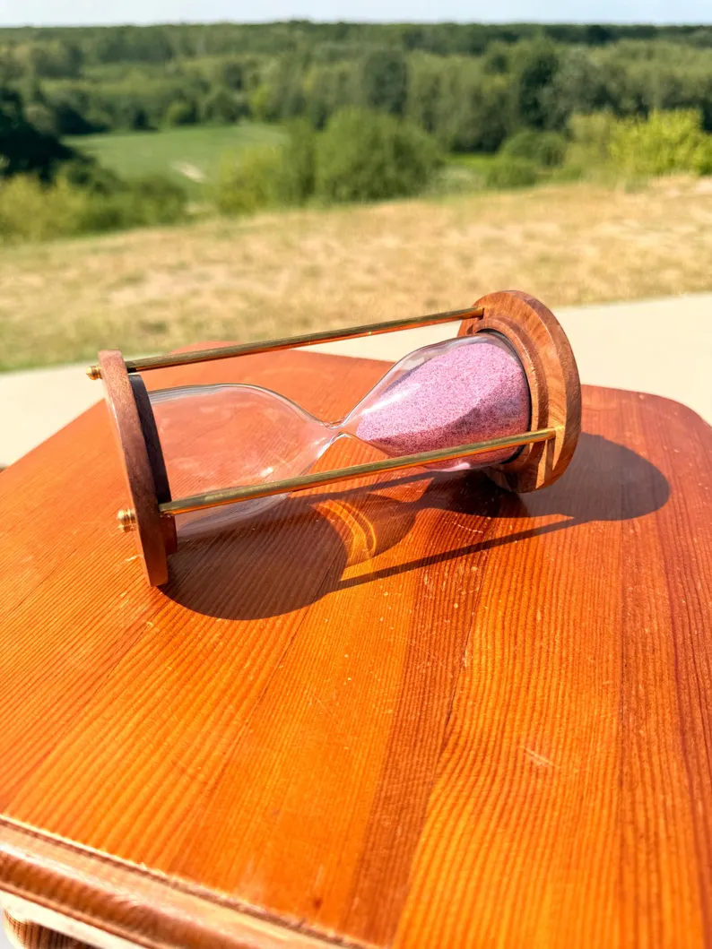 Add a touch of timeless charm to your space with this exquisite vintage-style hourglass, showcasing a rare and beautiful combination of purple and yellow sand. Crafted with a solid wooden base, elegant brass pillars, and clear glass chambers, this piece brings classic sophistication to any room.